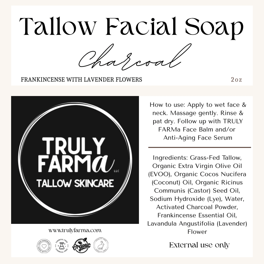 Our face-specific soap completes our tallow-based skincare line by giving you a gentle, organic, healthy & effective choice for your facial cleanser.  Made with rich, nutrient-dense grass-fed tallow, these 2 oz bars deeply nourish and restore balance to your skin.  We’ve blended activated charcoal for its powerful cleansing properties to help gently draw out impurities while keeping your skin’s natural barrier intact.  Every bar in finished with lavender flowers, providing a soft exfoliant.
